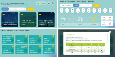 - 음소, 음절, 단어의 순차적 음성 출력 및 디스플레이 기능이 있어 낱글자 학습이 가능