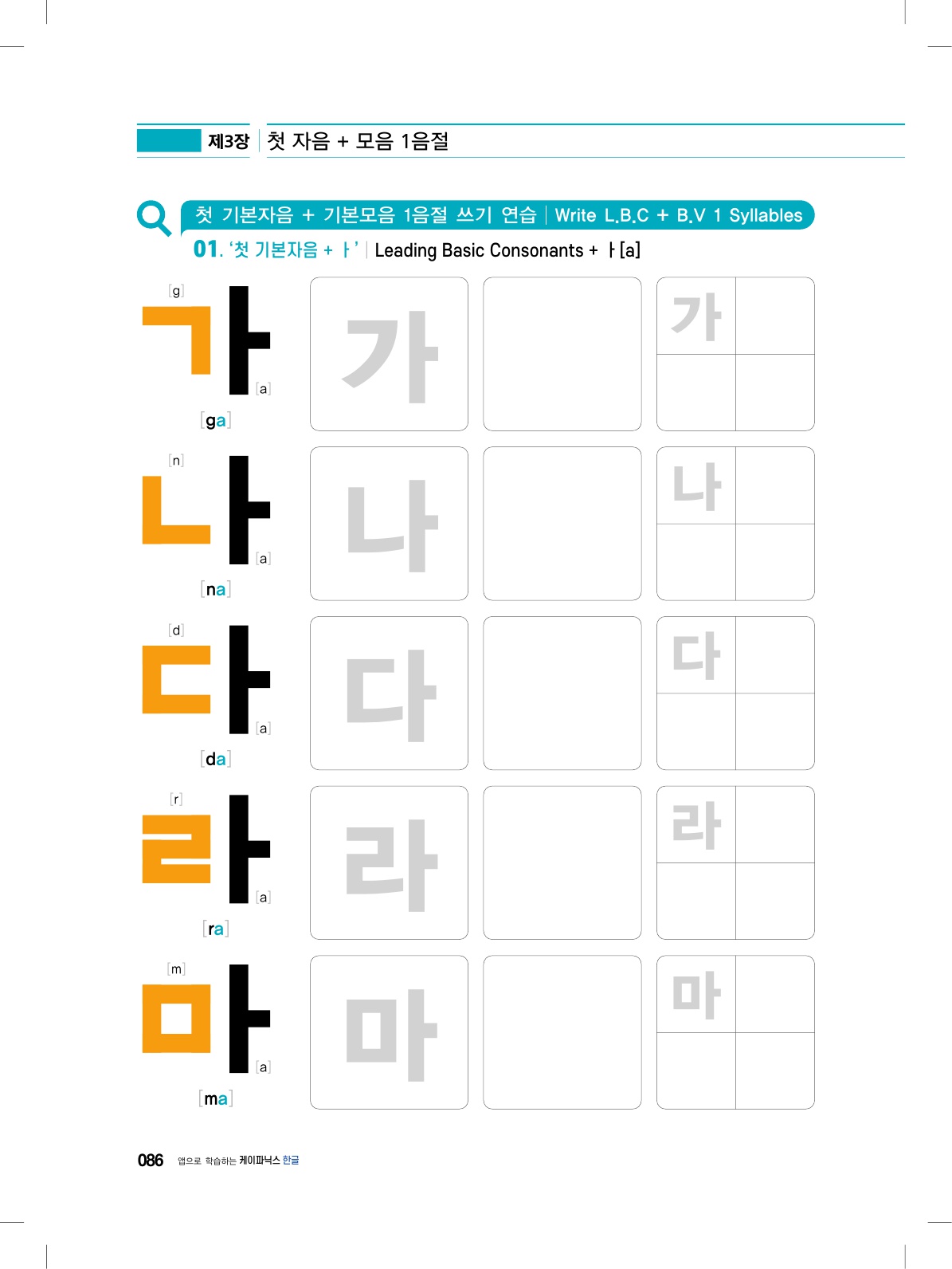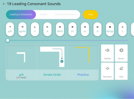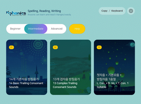 모음, 자음, 받침자음, 낱말구성, 음운규칙, 문장읽기 순으로 한글을 쉽게 배울 수 있게 구성 되었습니다