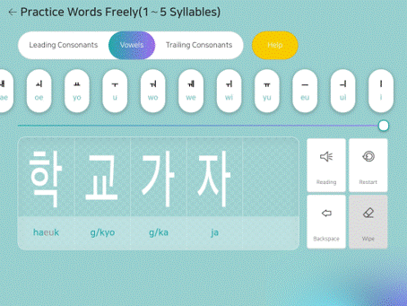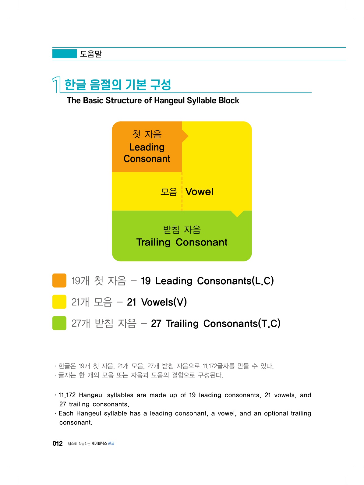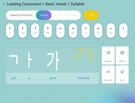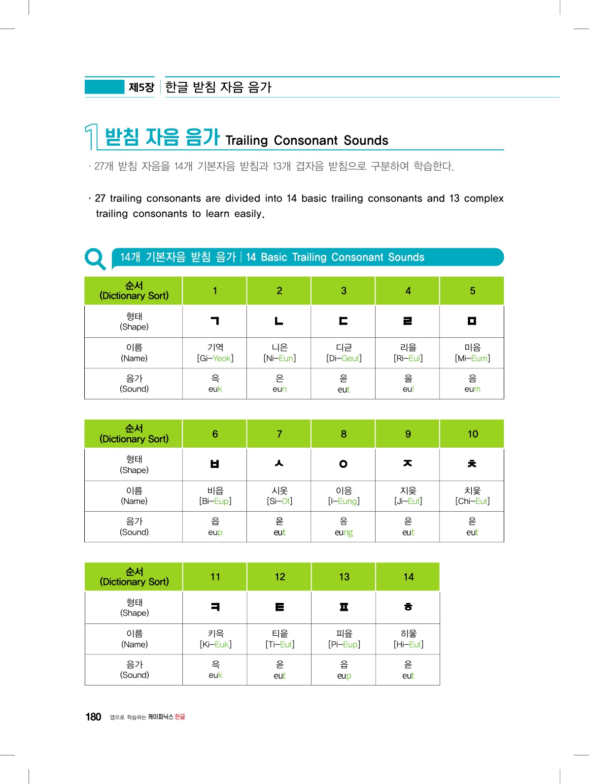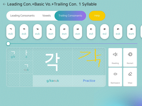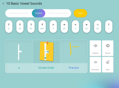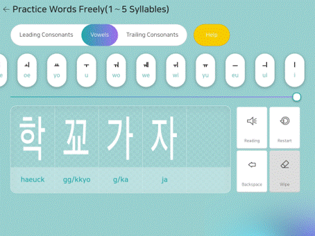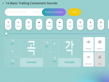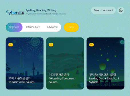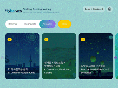 모음, 자음, 받침자음, 낱말구성, 음운규칙, 문장읽기 순으로 한글을 쉽게 배울 수 있게 구성 되었습니다